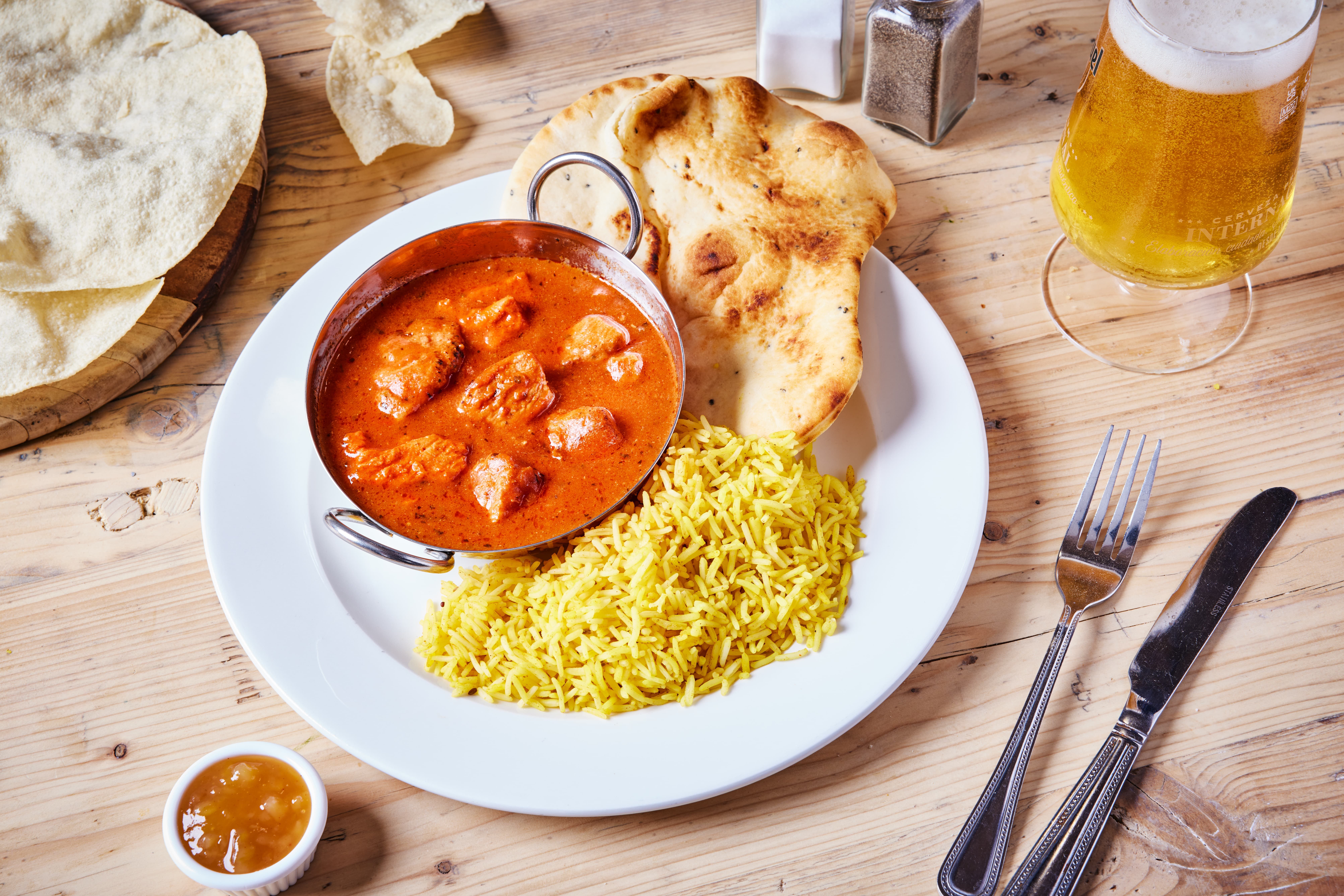 Who doesn’t love a tasty pub curry, served alongside fluffy pilau rice, toasted naan and crisp poppadoms with chutney?